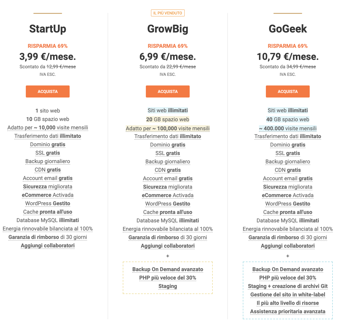 Questo plan è indicato, per chi è agli inizi. Puoi installare un solo sito web, hai a disposizione 10GB di spazio web, puoi ospitare fino a 10,000 visitatori unici al mese, dominio internet incluso, indirizzi email inclusi, certificato ssl Let’s Encrypt incluso, backup del sito gratuito (ma non il ripristino) e altre features che puoi verificare a questo link > Features StartUP
