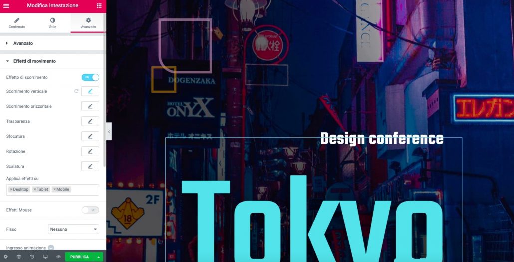 Puoi anche decidere su quale dispositivo verrà applicato l’effetto: Desktop, Tablet, Mobile.