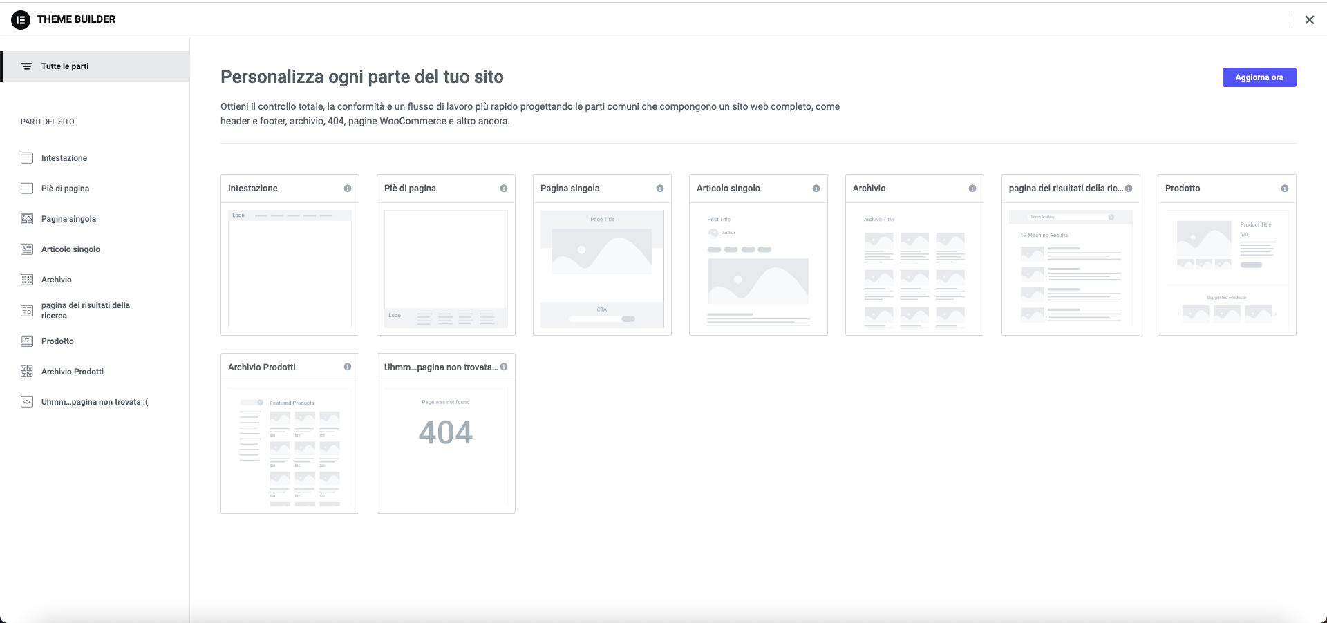 Il Theme Builder di Elementor Pro ti permette di creare i tuoi template personalizzati e ti permette di personalizzare tutte le parti del tuo sito web compresi:
