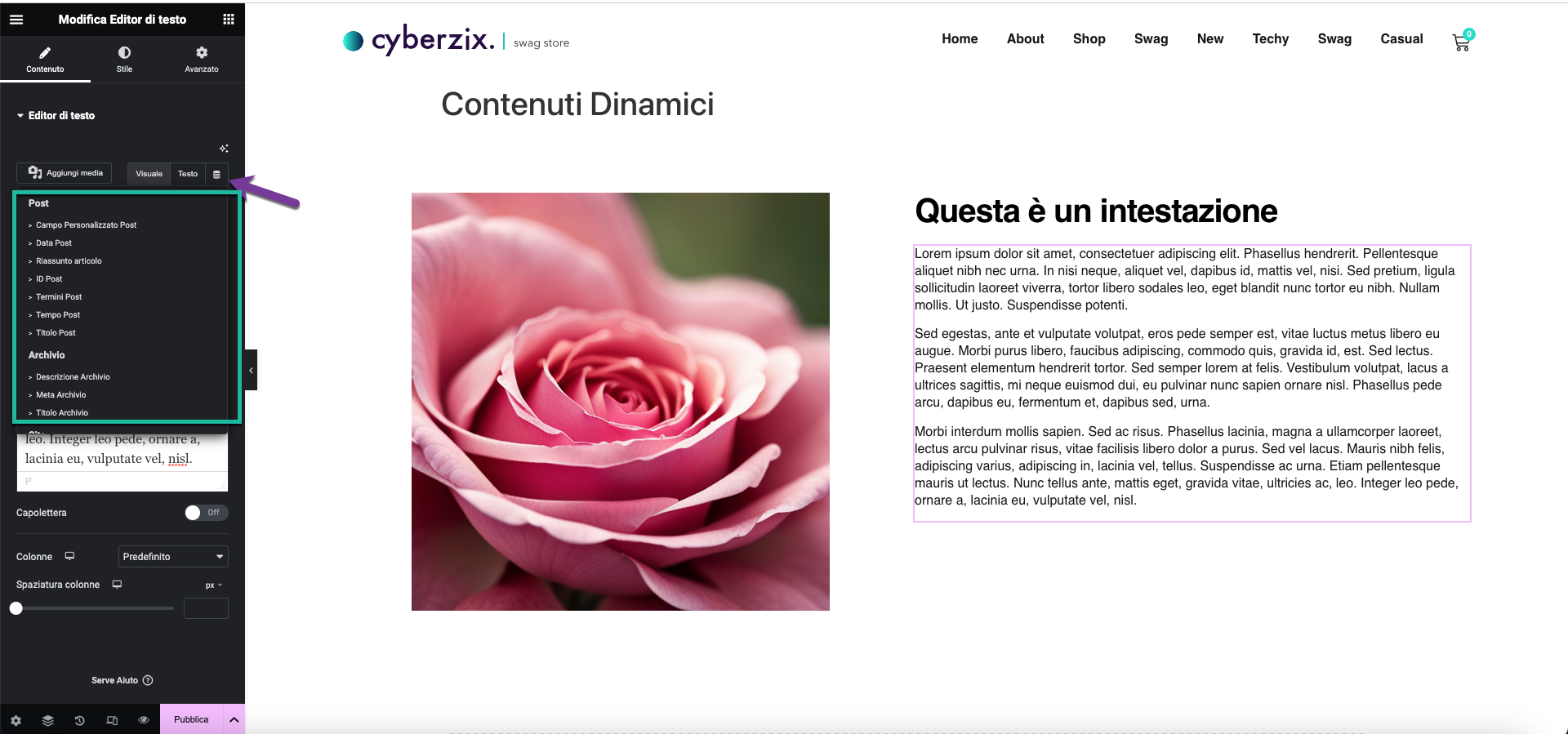 Inserisci un elemento di testo nella pagina, successivamente clicca sull’iconcina indicata dalla freccia nell’immagine sopra.