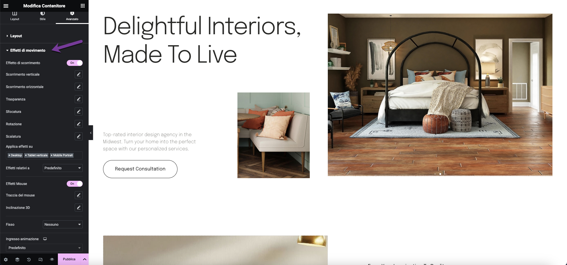 Puoi inserire uno scroll verticale, uno scroll orizzontale, un elemento a entrata ritardata, oggetti che entrano in pagina con un effetto di rotazione.