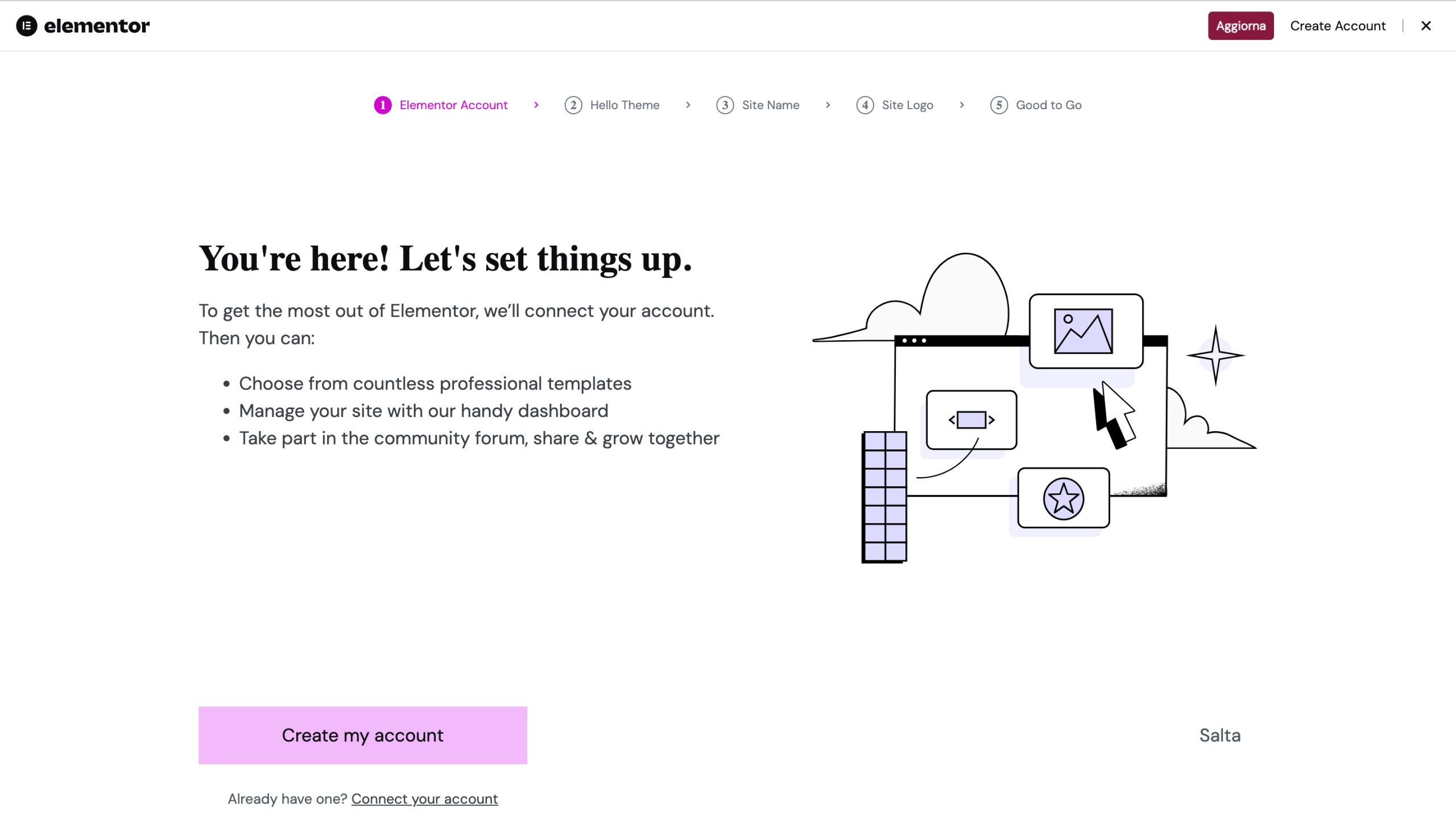 Il primo passo da fare, è la configurazione dell’account di Elementor, puoi creare il tuo nuovo account se parti da zero o altrimenti se hai già un account puoi connettere il tuo nuovo sito web a Elementor.com