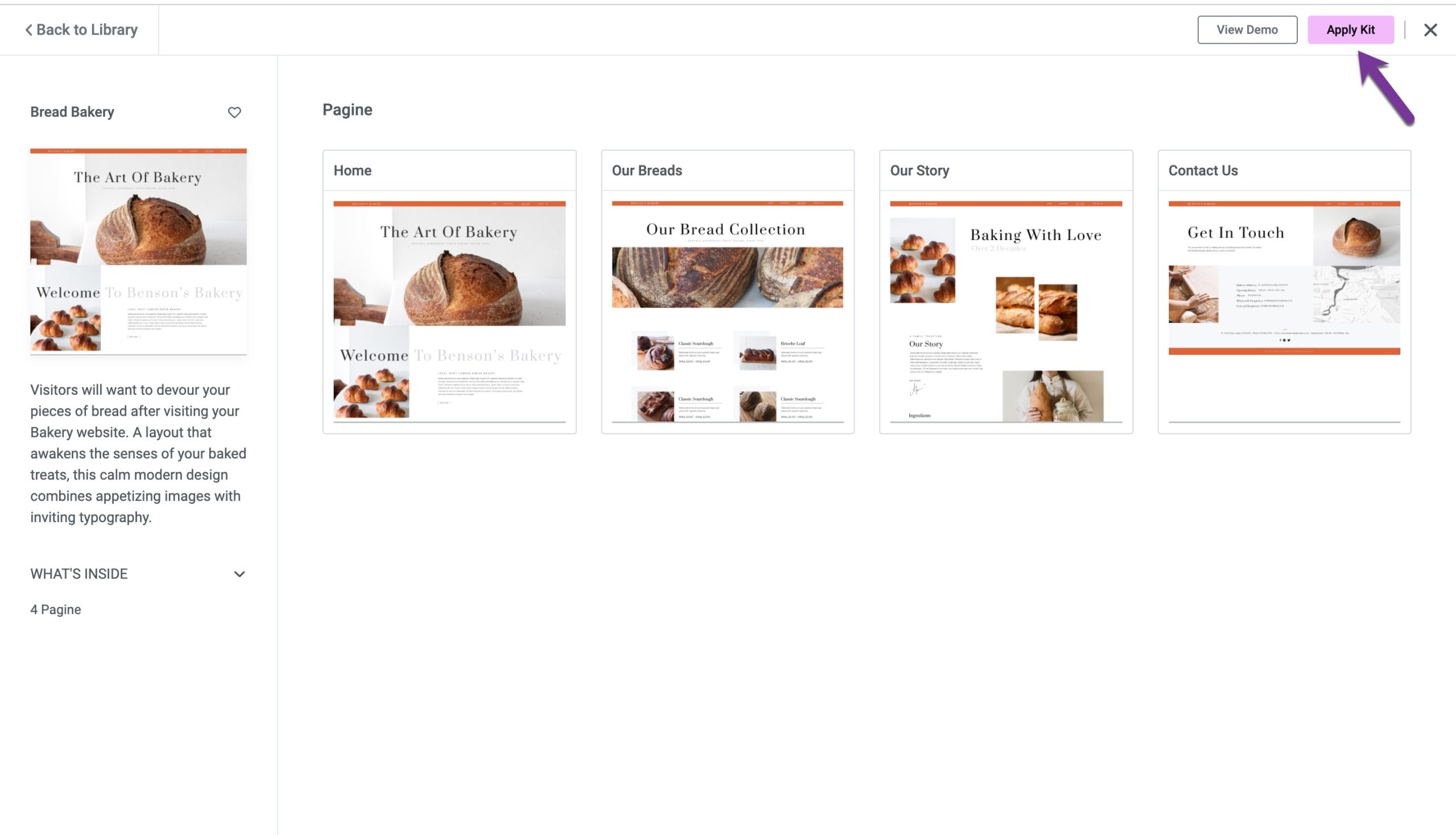Se il Kit è di tuo gradimento, non ti rimane che cliccare su “Applica kit” per importare il tuo nuovo sito web pronto all’utilizzo.