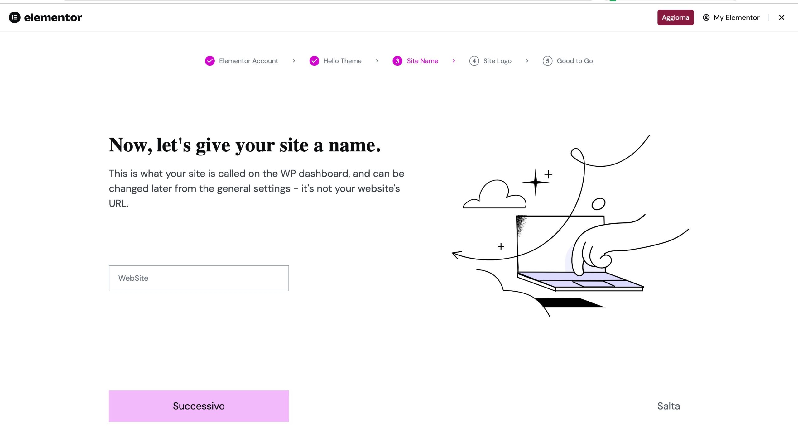Nel terzo step del Wizard di Elementor, hai la possibilità di inserire il nome del tuo sito web senza dovere andare nelle impostazioni di WordPress.