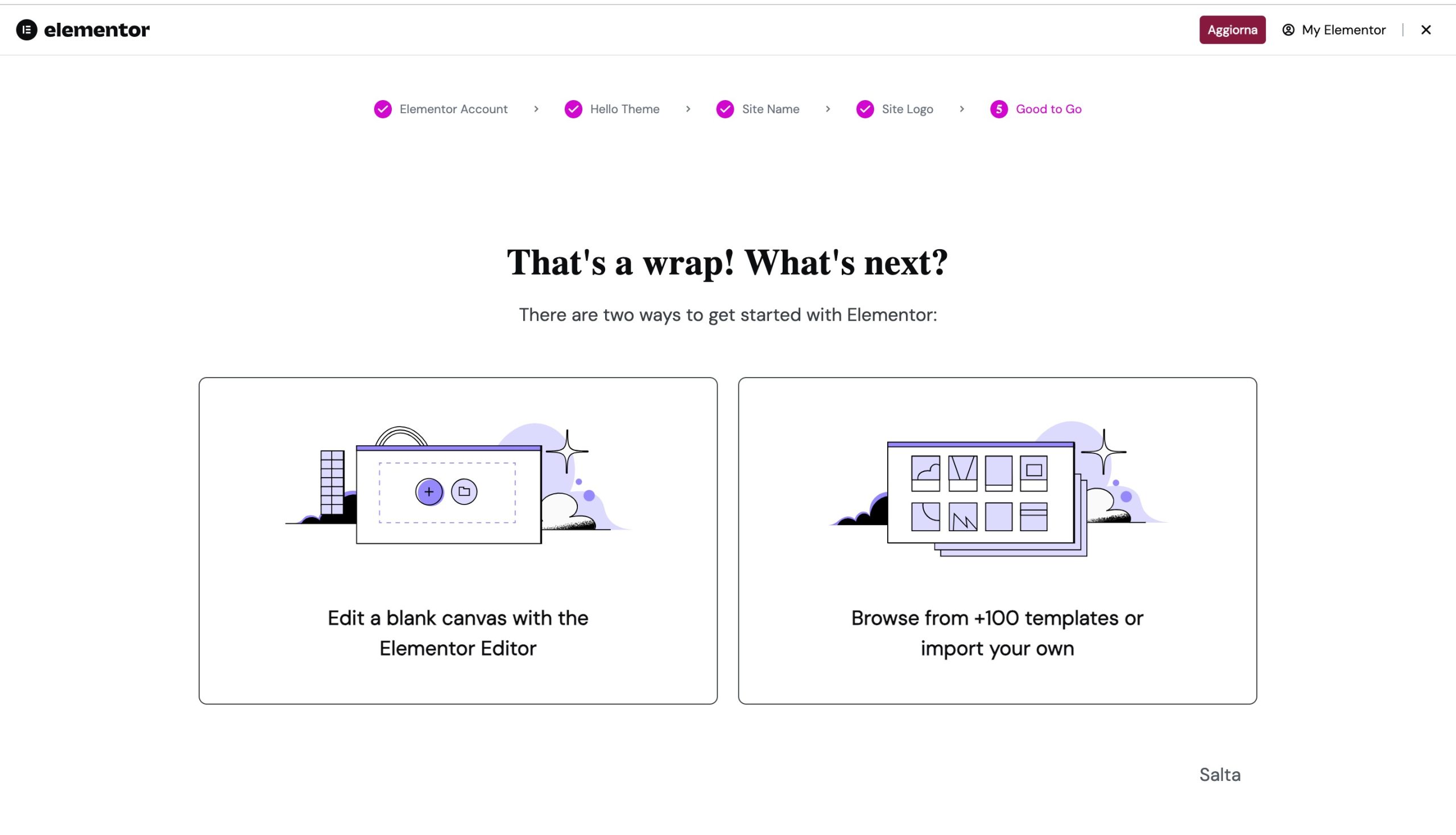 Nello step finale del wizard di Elementor, puoi scegliere se iniziare dal una pagina nuova la tua esperienza con Elementor o Importare un template.