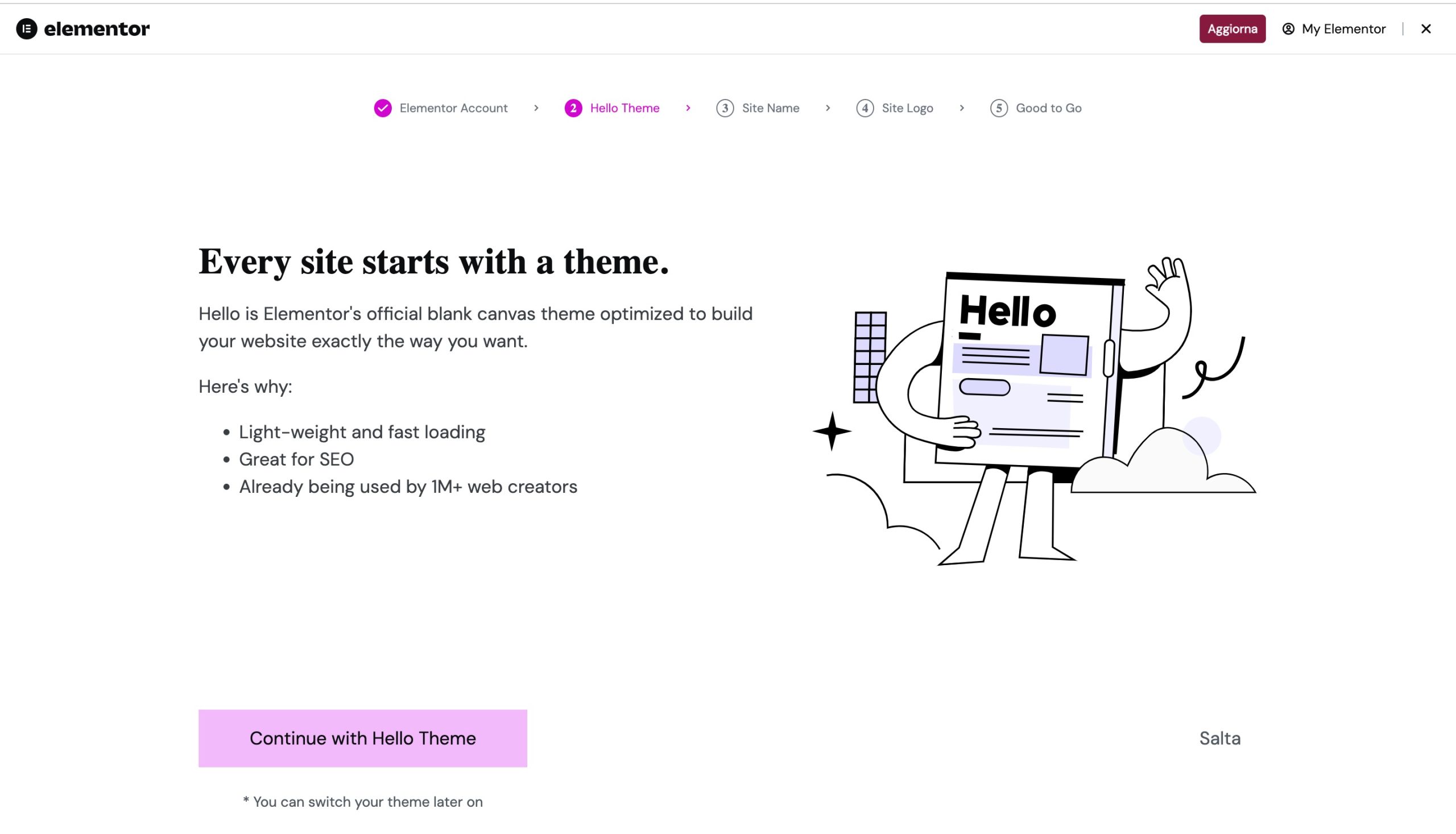 Il secondo passaggio del Wizard di Elementor è l’installazione di Hello Theme il tema di Elementor creato appositamente per il page builder compatibile al 100%.