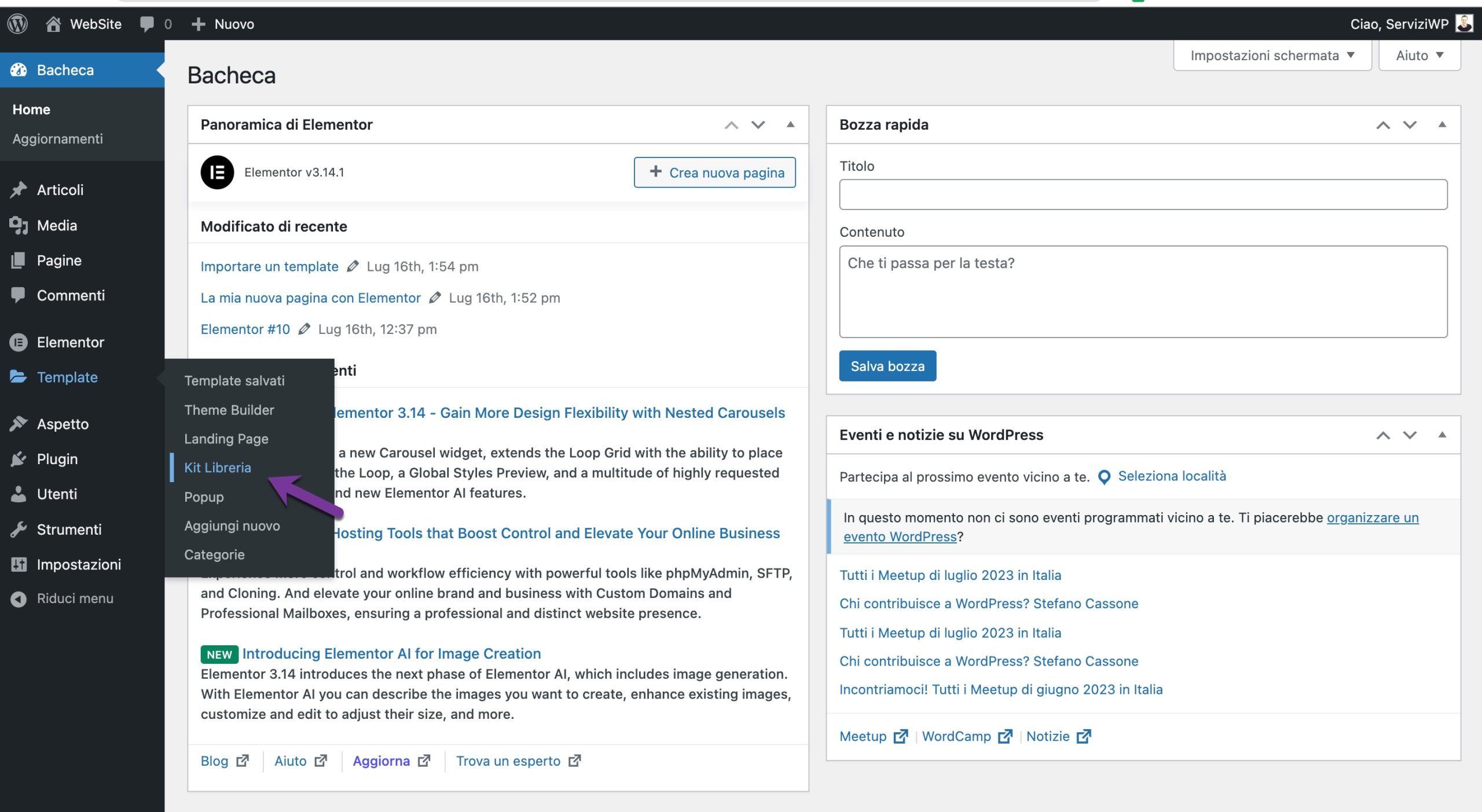 Per iniziare vai alla barra laterale di WordPress e sotto la voce “Template” di Elementor nel sotto menu clicca sulla scritta “Kit Library“