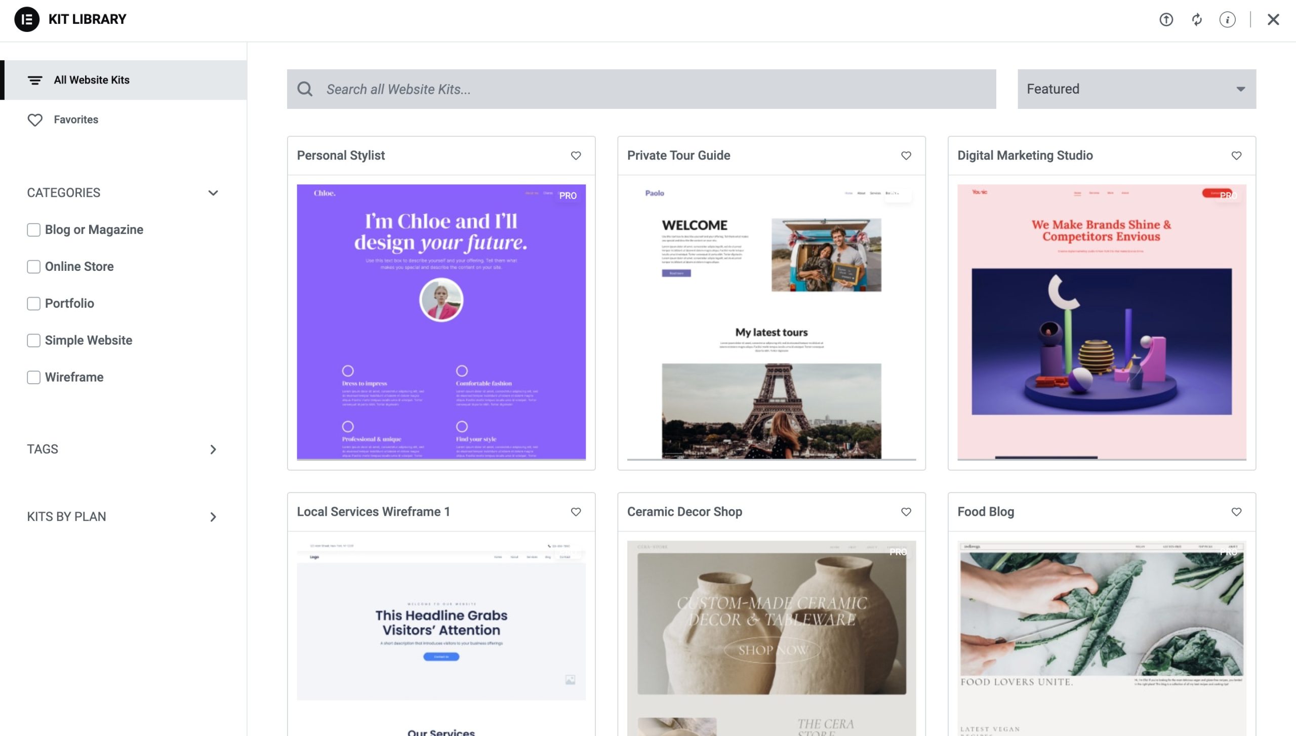 Subito dopo si aprirà la libreria dei kit di Elementor dalla quale potrai scegliere il tuo kit completo.