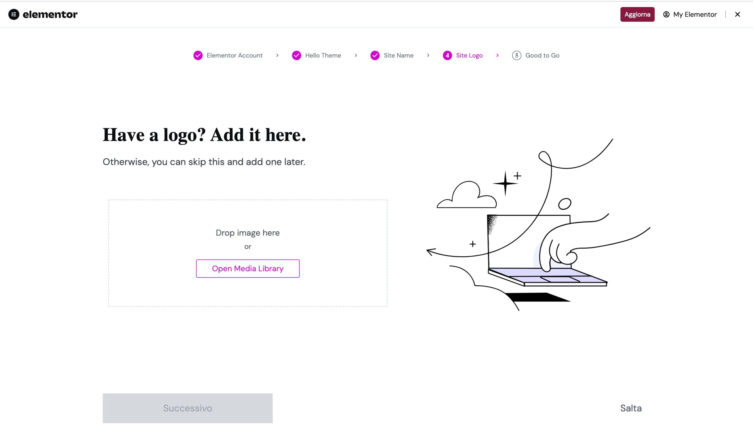 Nel quarto step di configurazione di Elementor wizard, potrai caricare il logo del tuo sito web direttamente dal configuratore di Elementor.