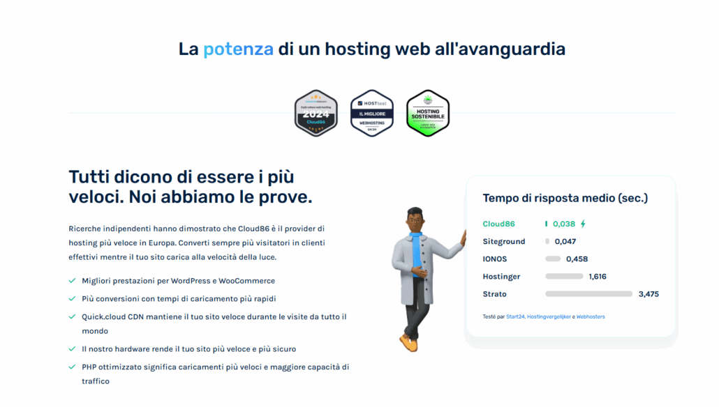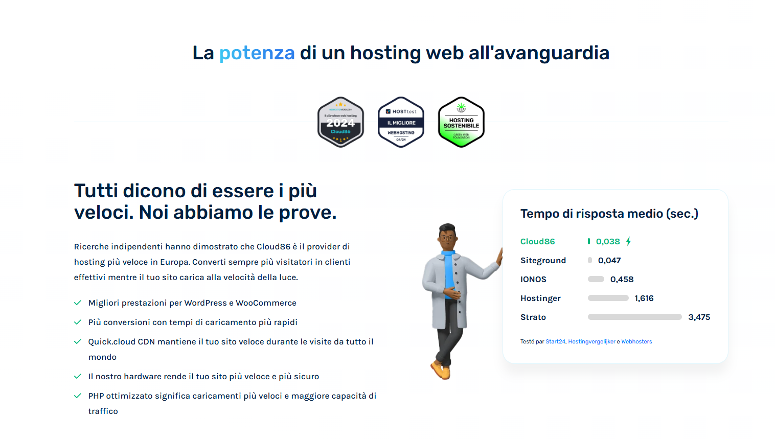 Se gestisci un sito web piccolo o medio e ti interessa velocità, stabilità e prezzi onesti, Cloud86 è una scelta eccellente — ed è già stato riconosciuto come il provider di hosting più veloce in Italia nei test recenti.