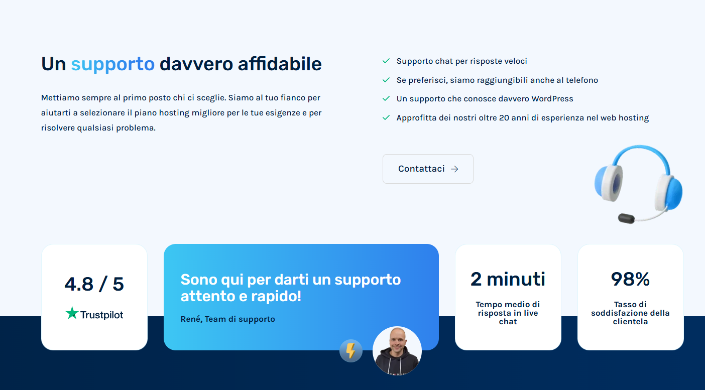 Ottieni sicurezza, backup giornalieri, un dominio .IT gratuito, migrazione professionale inclusa e supporto rapido — anche con i piani più economici. Le uniche vere limitazioni sono l’assenza del supporto telefonico 24/7 e le specifiche VPS non troppo generose.